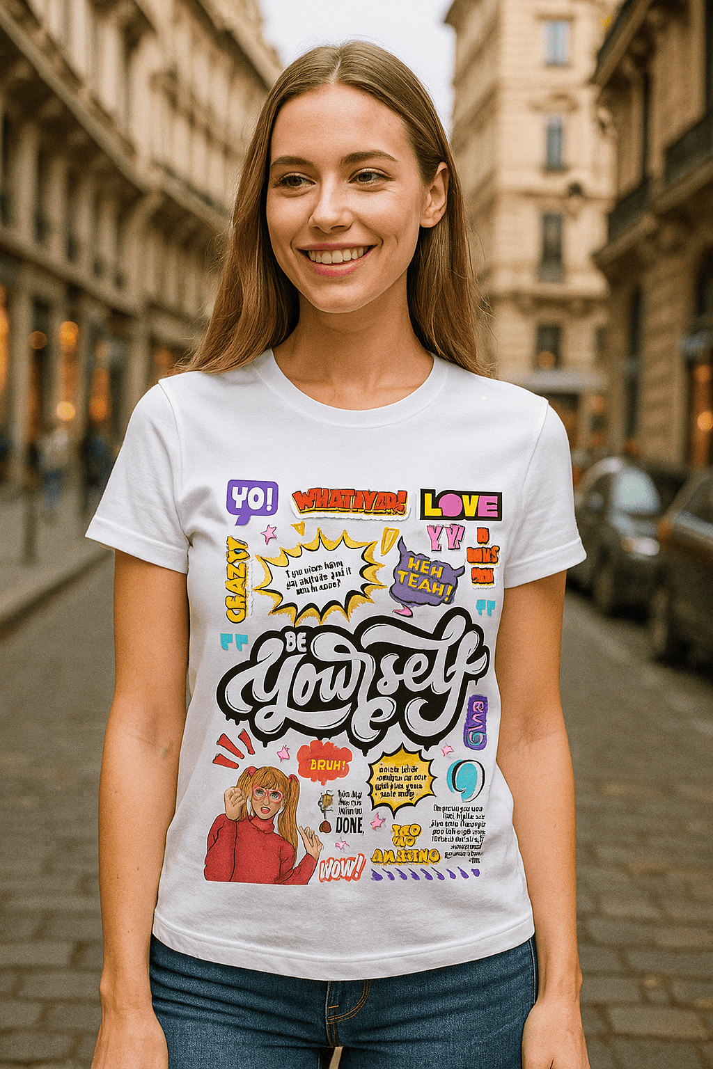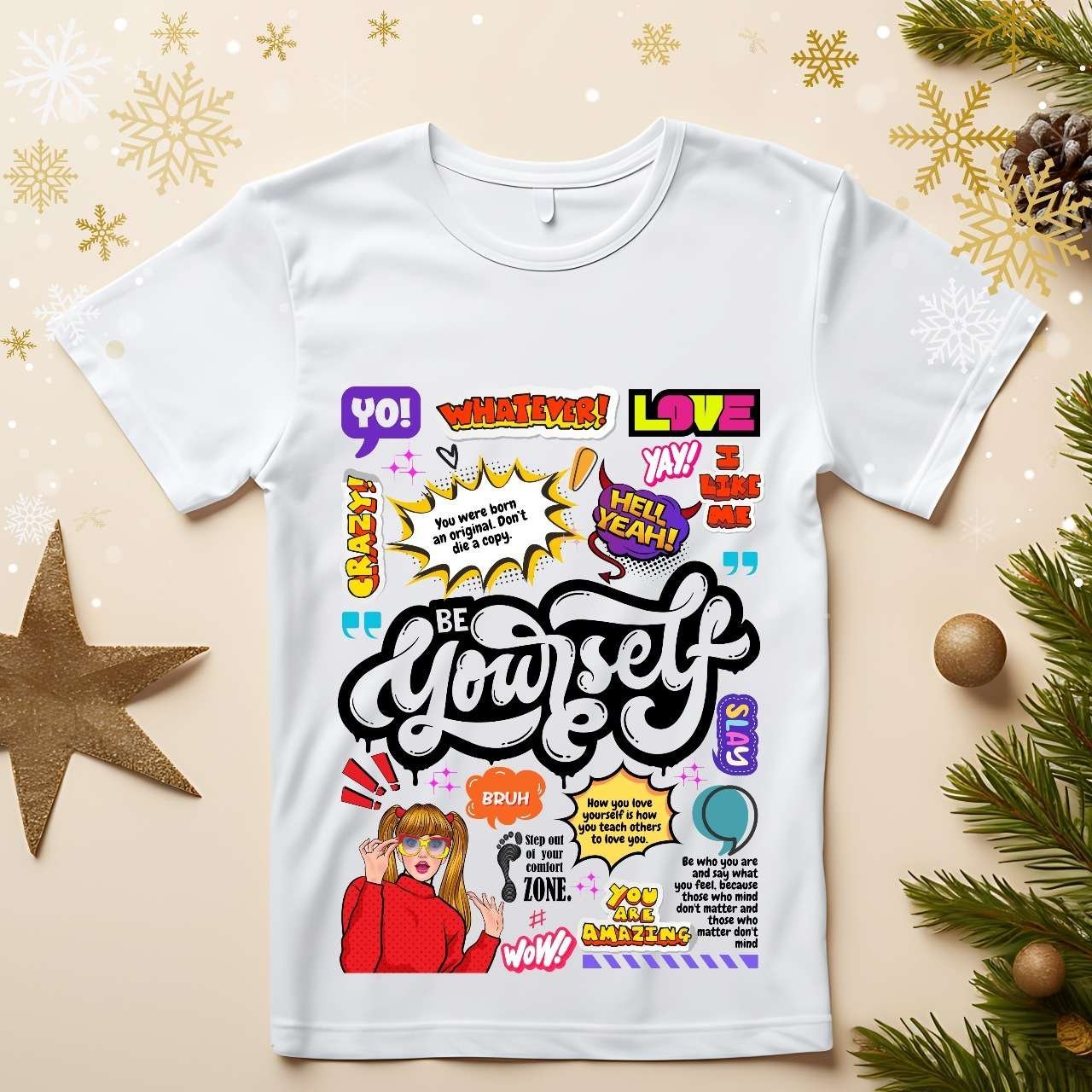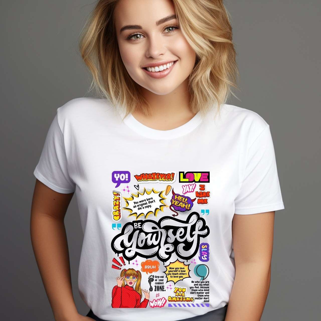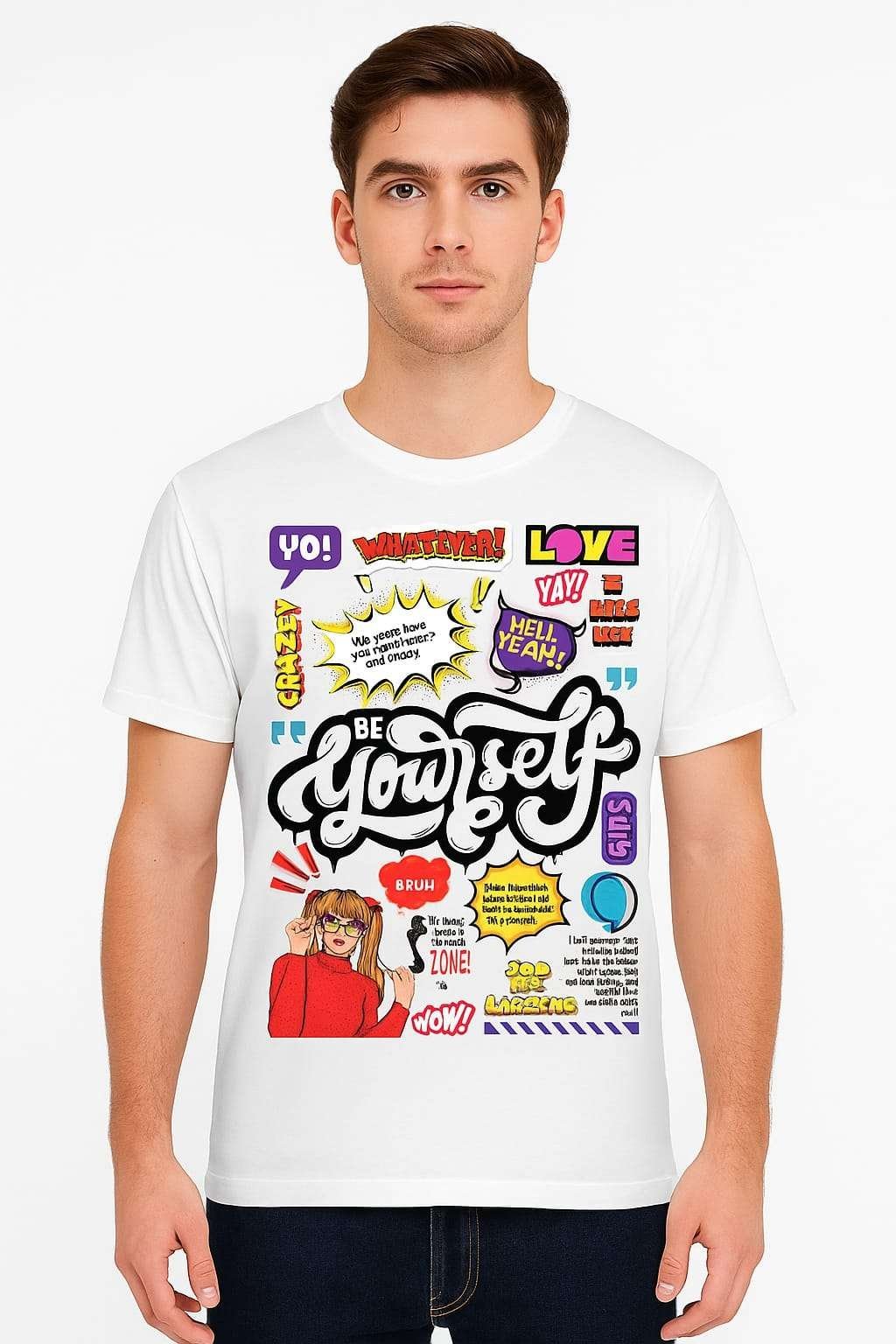 Show off your personality with the Be Yourself Unisex Graphic T-Shirt, bold and vibrant piece designed for both men and women. Crafted from premium cotton, this black tee features a colorful retro-inspired print filled with playful text, pop-art elements, and motivational vibes. Its soft fabric and relaxed fit make it perfect for everyday wear, casual outings, or gifting to someone who loves unique fashion. Pair it with jeans, shorts, or layered looks to create your own confident style statement.